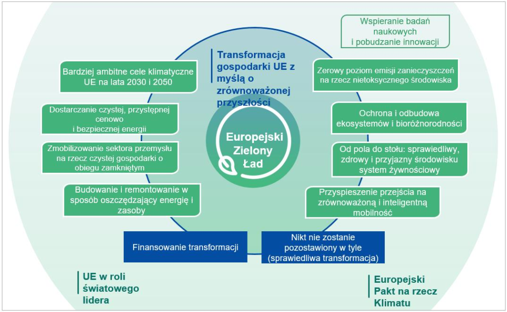 Fundamentalnym celem Europejskiego Zielonego Ładu jest przeciwdziałanie globalnym zmianom klimatycznym, co wyrażone jest w deklaracjach politycznych dotyczących: